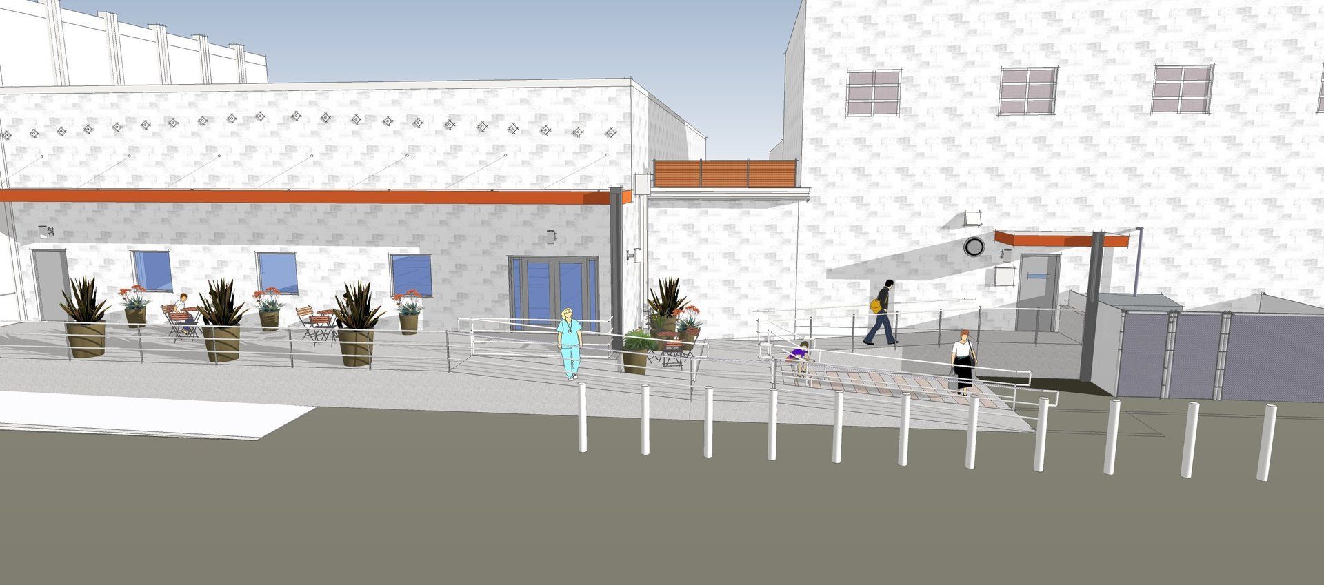 The renovation encompassed converting a secondary side door into a main entrance door and focal point for Building 25. This involved retrofitting the North door with ADA accessible route and associated renovations for egress because the current accessible East door would be obstructed for construction of an adjacent building. Therefore, GPa provided a permanent ADA access ramp for the new entrance that would blend with the design and be approved with formal application to the Department of the State Architect.