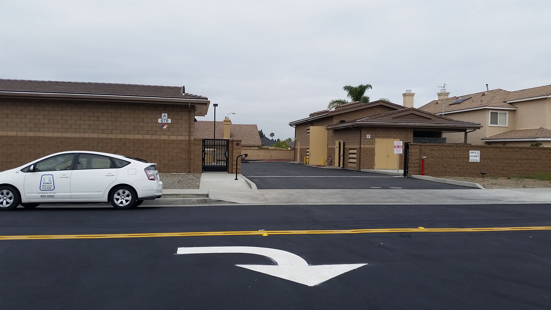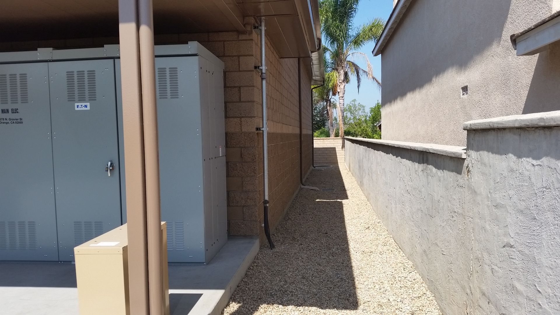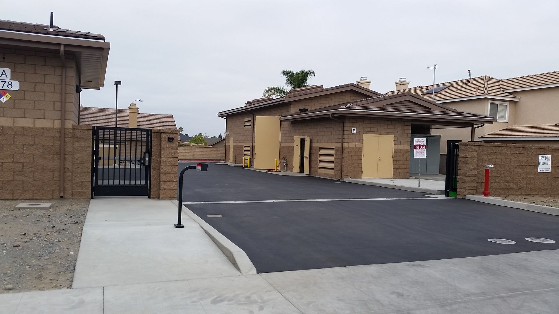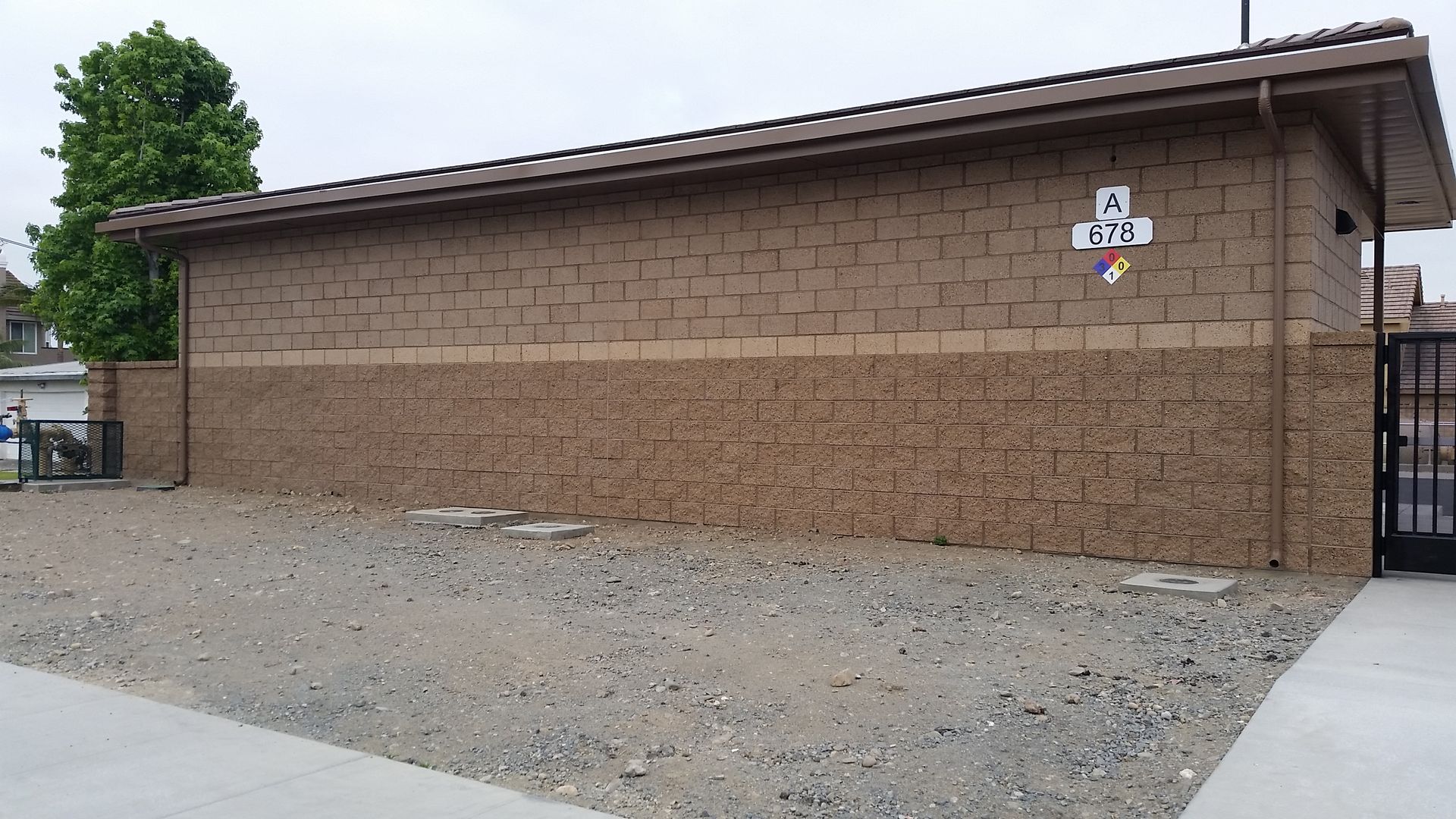 The CMU walls are topped off by gable shaped concrete tile roofing that mimics the form and look of nearby roofs. The middle portion of the Pump Building extends into a flat roof profile for well head access. This flat portion is obscured by a parapet and the gabled roof profiles on both ends. The street view of the facility reflects the proportion of the adjacent low linear profile of the Mid-Century California Ranch inspired houses adjacent to the facility. The enclosing building walls extend out beyond the building footprint and serve as site perimeter walls, delineated only by the access gates. These site walls are composed of the same decorative CMU used on the buildings. The access gates have simple metal pickets with a backing of decorative perforated metal to block transparency into the site.