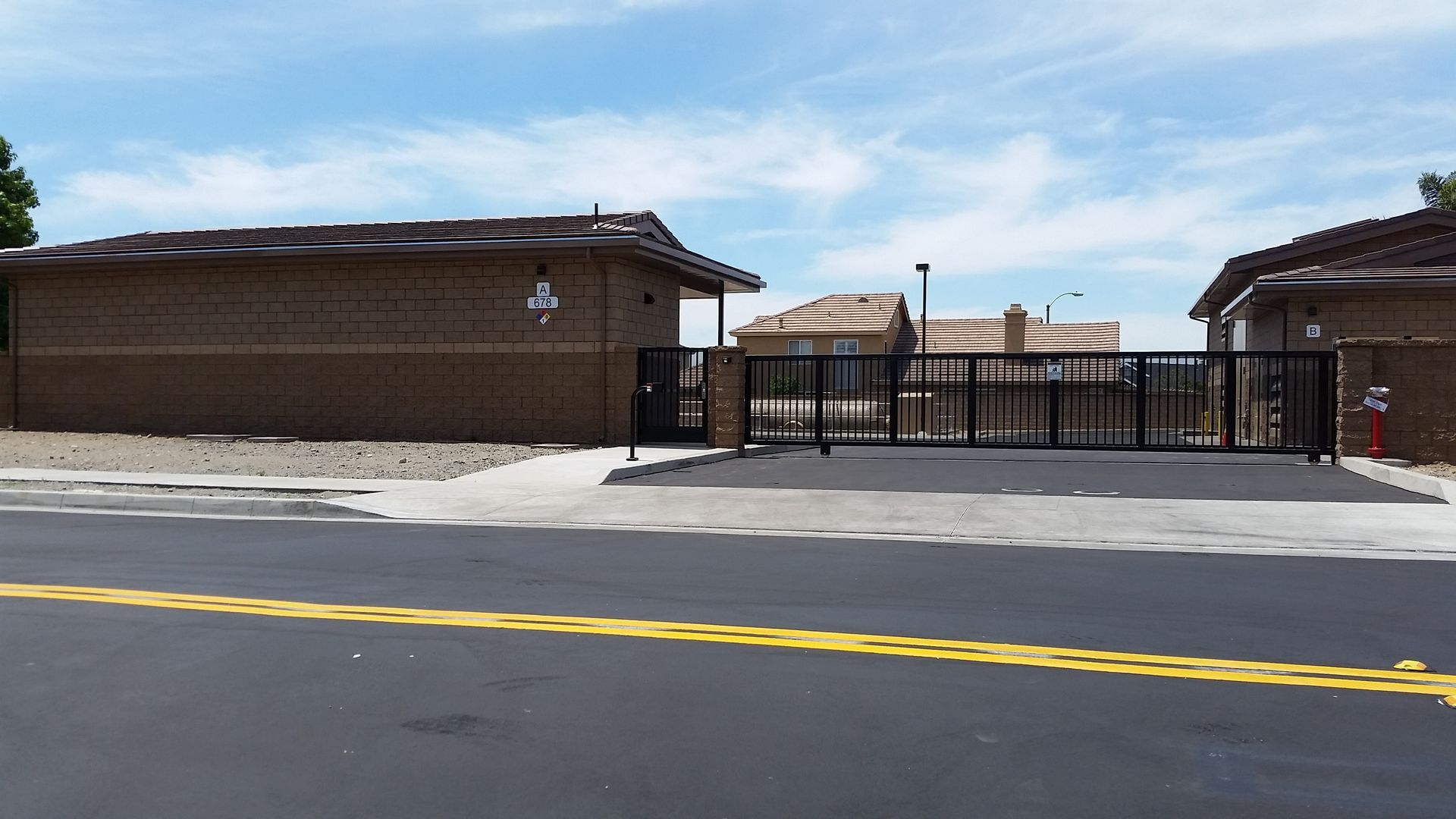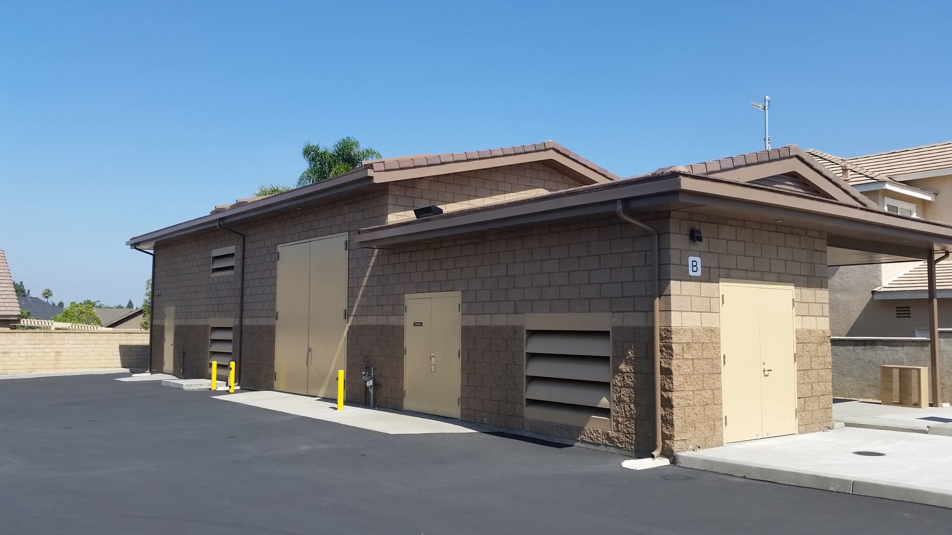 The CMU walls are topped off by gable shaped concrete tile roofing that mimics the form and look of nearby roofs. The middle portion of the Pump Building extends into a flat roof profile for well head access. This flat portion is obscured by a parapet and the gabled roof profiles on both ends. The street view of the facility reflects the proportion of the adjacent low linear profile of the Mid-Century California Ranch inspired houses adjacent to the facility. The enclosing building walls extend out beyond the building footprint and serve as site perimeter walls, delineated only by the access gates. These site walls are composed of the same decorative CMU used on the buildings. The access gates have simple metal pickets with a backing of decorative perforated metal to block transparency into the site.